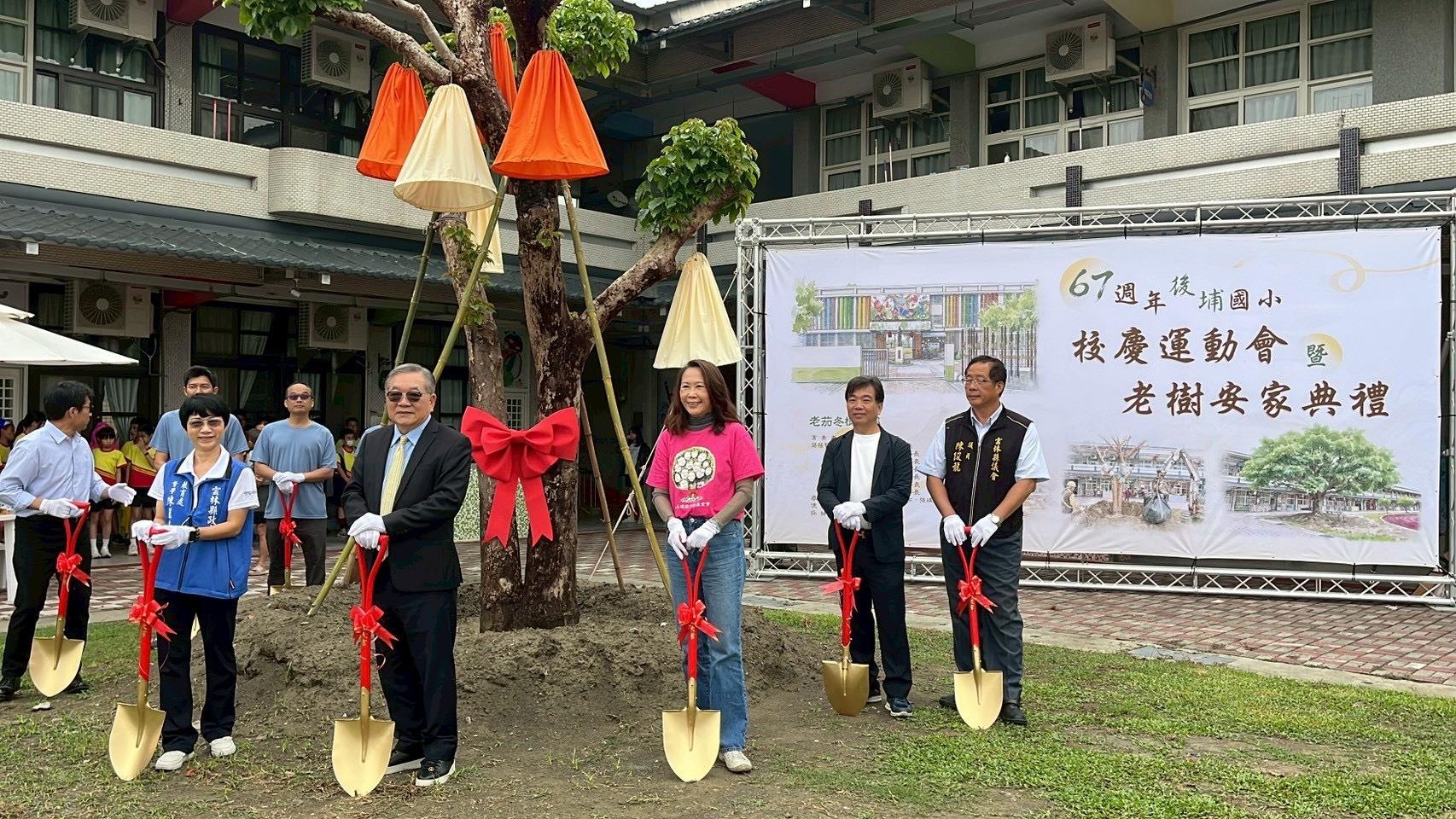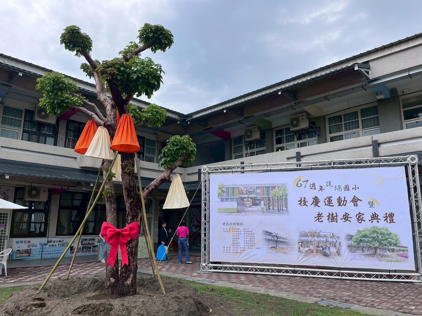 2026年4月25日星期六,在雲林後埔國小,雨縫日花中展開的老樹安家典禮,張燈結綵、熱鬧非凡。在溫情滿檔的新家裏,茄苳樹適應很快,綠芽冒得很開心,頭好壯壯,會跟著小朋友一起成長!